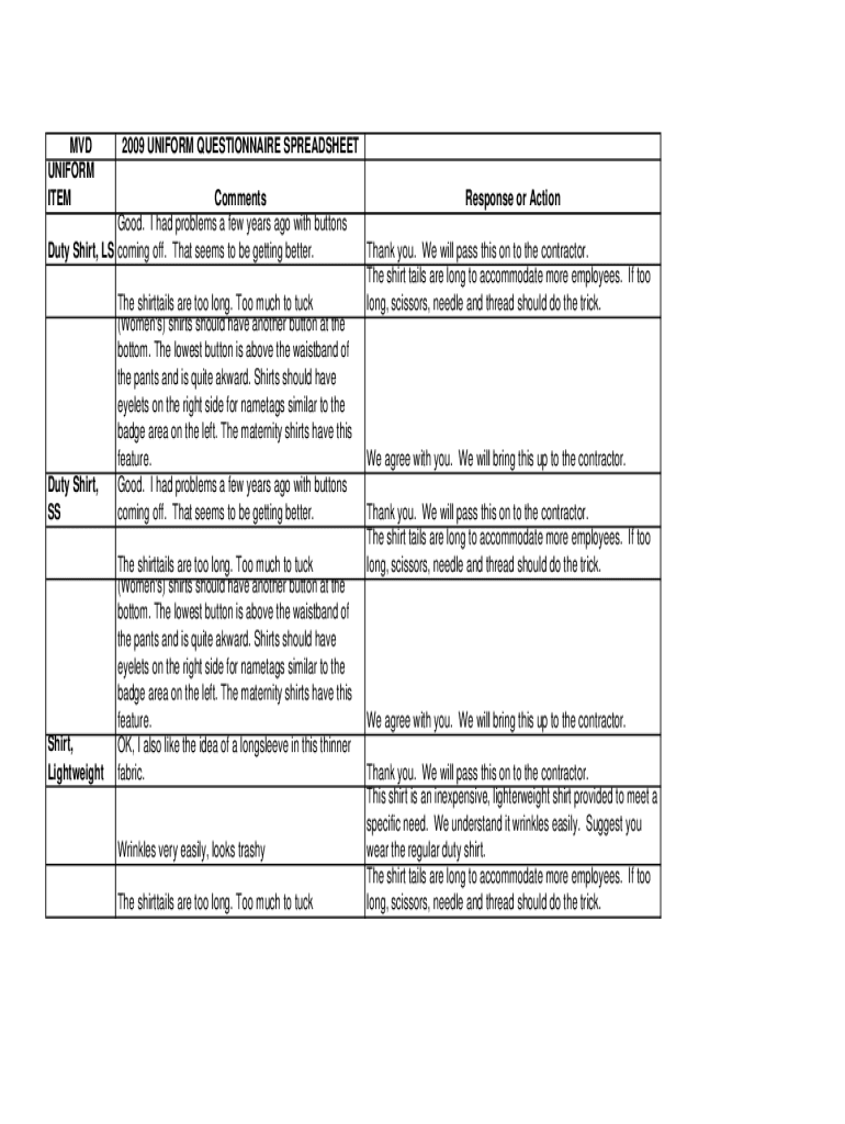 MVD UNIFORM ITEM2009 UNIFORM QUESTIONNAIRE SPREADSHEETComments Good. I had problems a few years ago with buttons Duty Shirt, LS coming off. That seems to be getting better. Duty Shirt, SST he shirttails