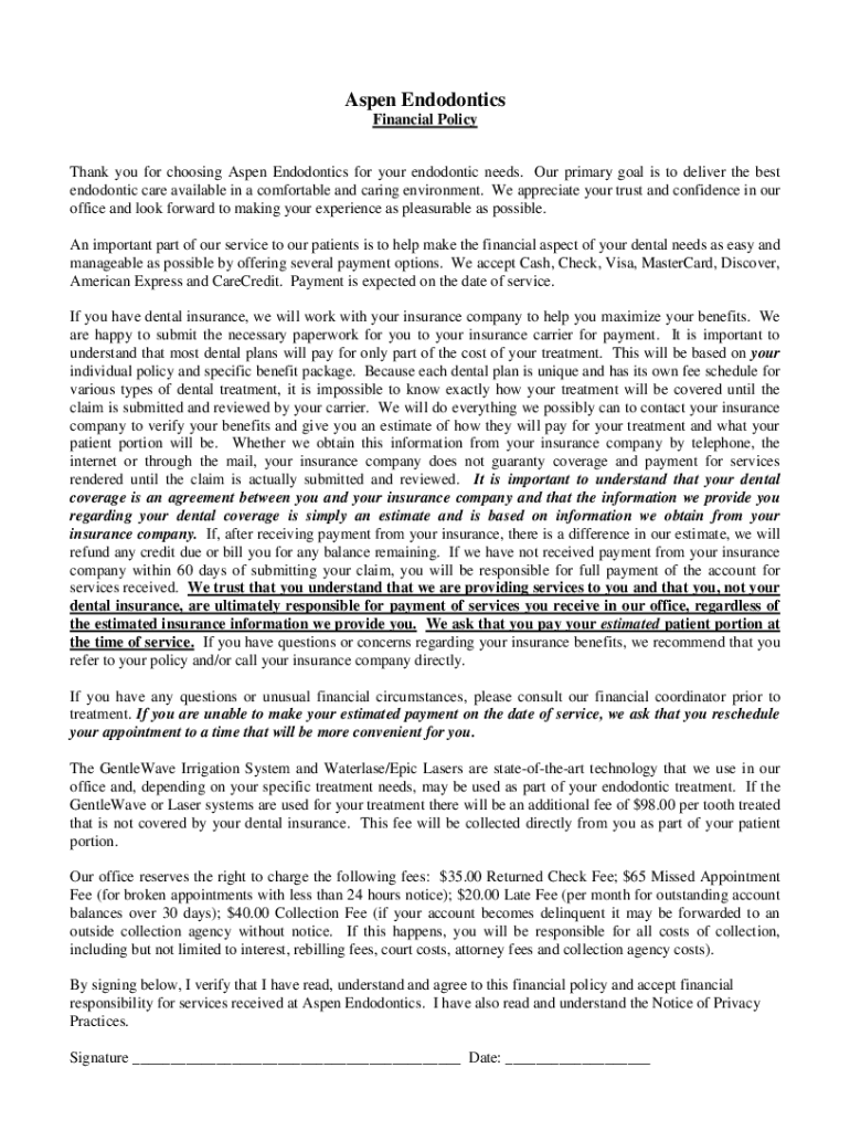 Aspen Endodontics Financial Policy Thank you for choosing Aspen Endodontics for your endodontic needs. Our primary goal is to deliver the best endodontic care available in a comfortable and caring