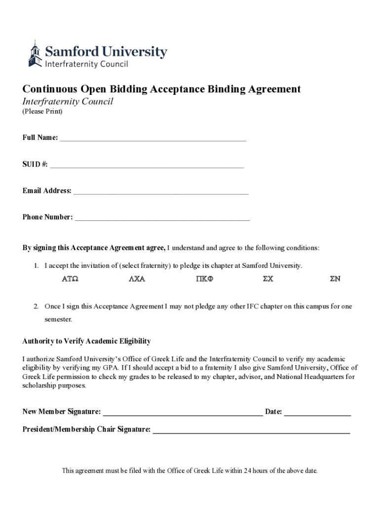 Continuous Open Bidding Acceptance Binding Agreement Interfraternity Council (Please Print) Full Name: ___ SAID #: ___ Email Address: ___ Phone Number: ___By signing this Acceptance Agreement agree,