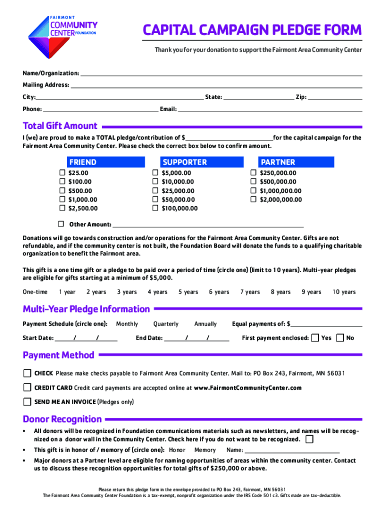 CAPITAL CAMPAIGN PLEDGE FORM Thank you for your donation to support the Fairmont Area Community Center Name/Organization:Mailing Address:City:State:Zip:Phone:Email:Total Gift Amount I (we) are proud