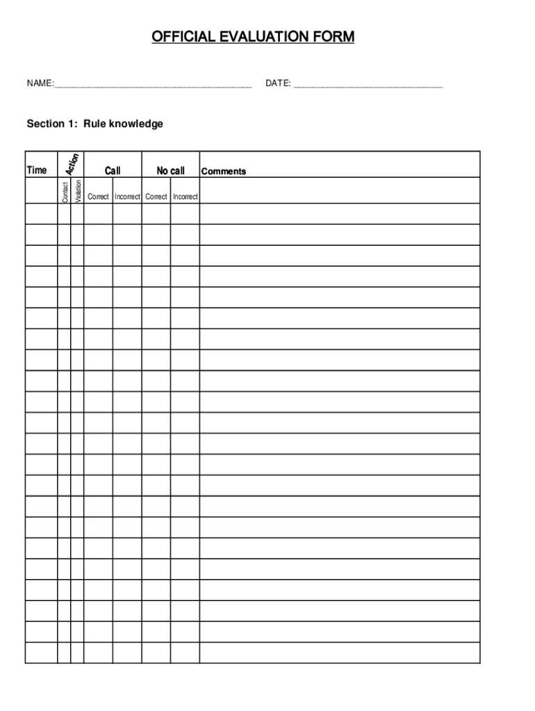 OFFICIAL EVALUATION FORM NAME:___ViolationContactTimeActi section 1: Rule knowledgeCallNo callCorrect Incorrect Correct IncorrectCommentsDATE: ___Action ViolationContactTimeCallNo callCorrect Incorrect