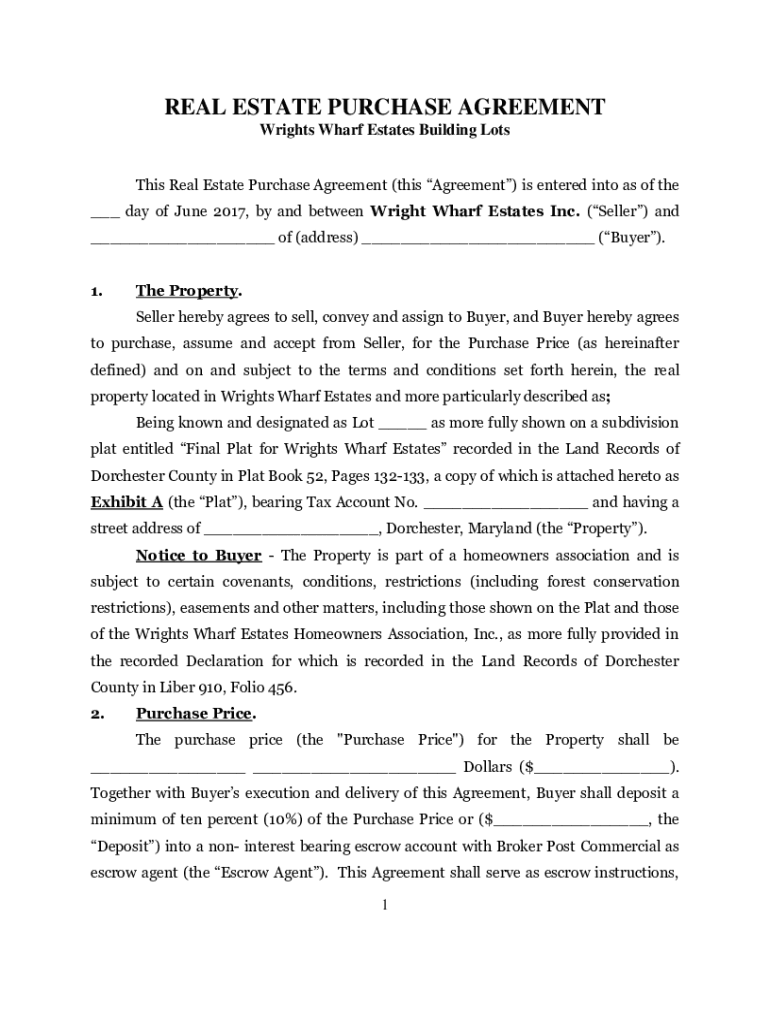 REAL ESTATE PURCHASE AGREEMENT Wrights Wharf Estates Building Lots This Real Estate Purchase Agreement (this Agreement) is entered into as of the ___ day of June 2017, by and between Wright Wharf