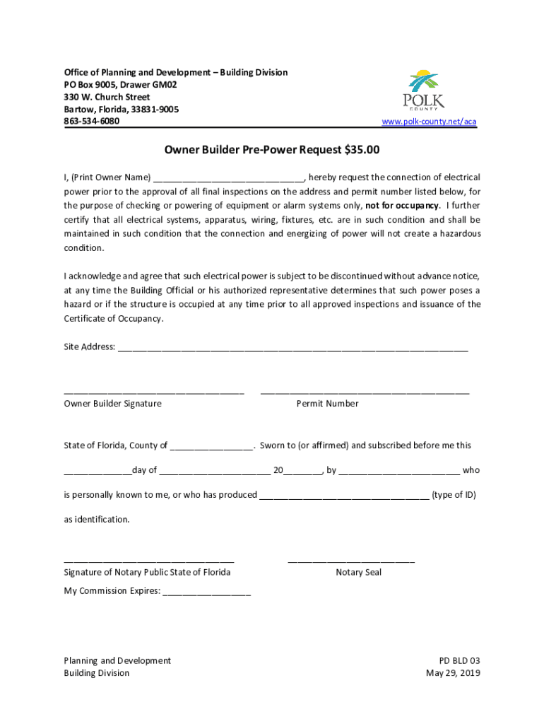 Office of Planning and Development Building Division PO Box 9005, Drawer GM02 330 W. Church Street Barton, Florida, 338319005 8635346080www.polkcounty.net/acaOwner Builder Repower Request $35.00 I,