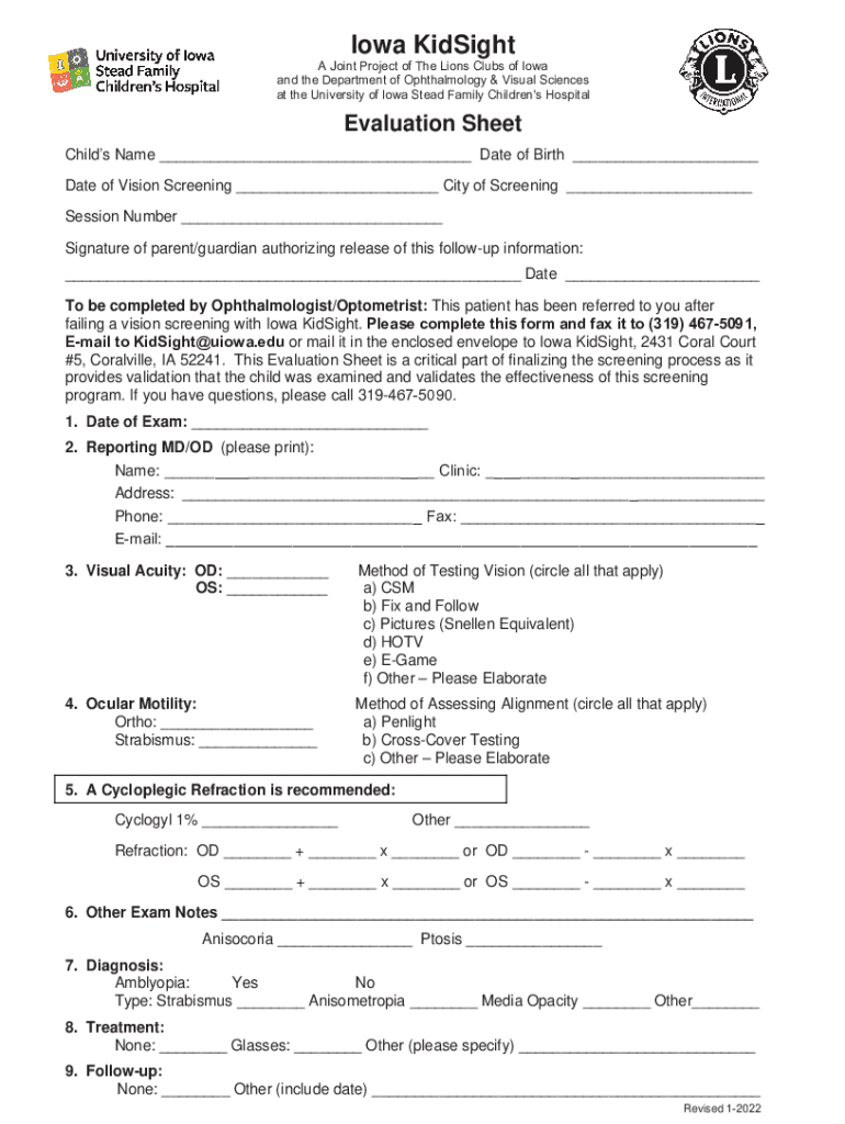 Iowa Insight Joint Project of The Lions Clubs of Iowa and the Department of Ophthalmology & Visual Sciences at the University of Iowa Stead Family Children\'s HospitalEvaluation Sheet Child's Name