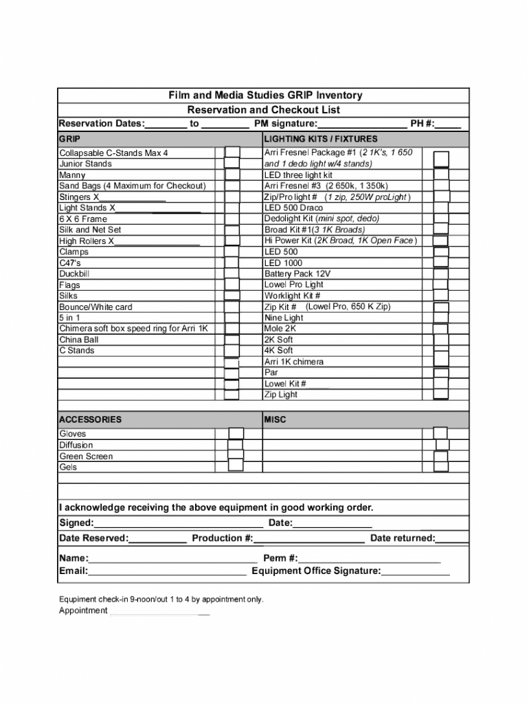 Reservation Dates:Film and Media Studies GRIP Inventory Reservation and Checkout List trip Collapsible Stands Max 4 Junior Stands Much Sand Bass (4 Maximum for Checkout) Stingers X Light Stands X