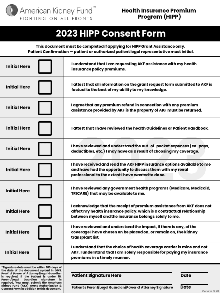 Health Insurance Premium Program (HIP) 20232023 HIP Consent Forms document must be completed if applying for HIP Grant Assistance only. Patient Confirmation patient or authorized patient legal representative