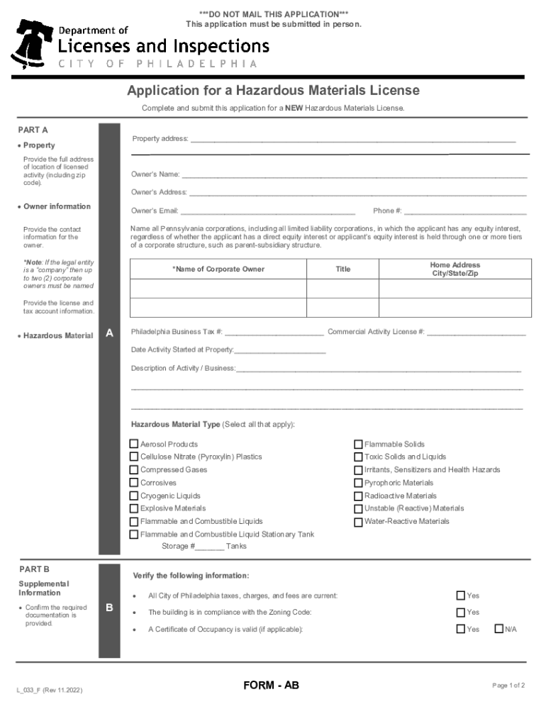 ***DO NOT MAIL THIS APPLICATION*** This application must be submitted in person. Application for a Hazardous Materials License Complete and submit this application for a NEW Hazardous Materials License.