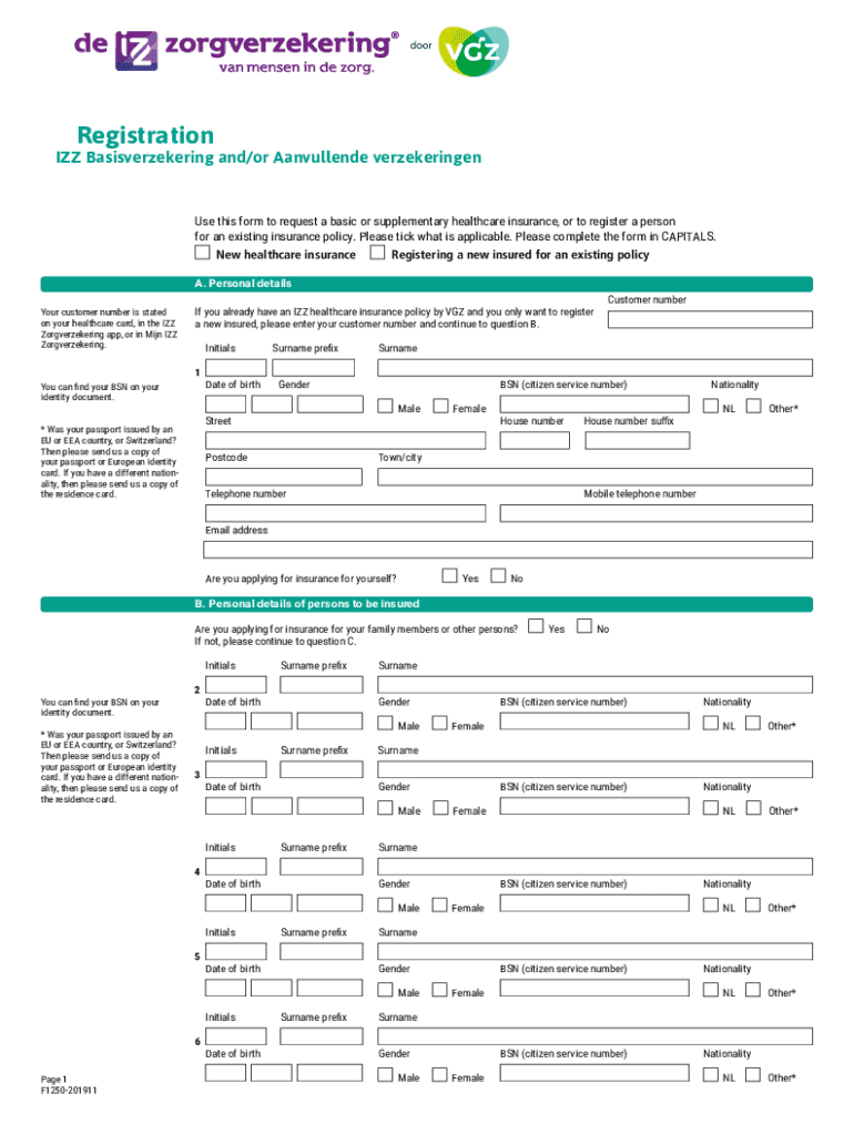 Registration Basisverzekering and/or Aanvullende verzekeringenUse this form to request a basic or supplementary healthcare insurance, or to register a person