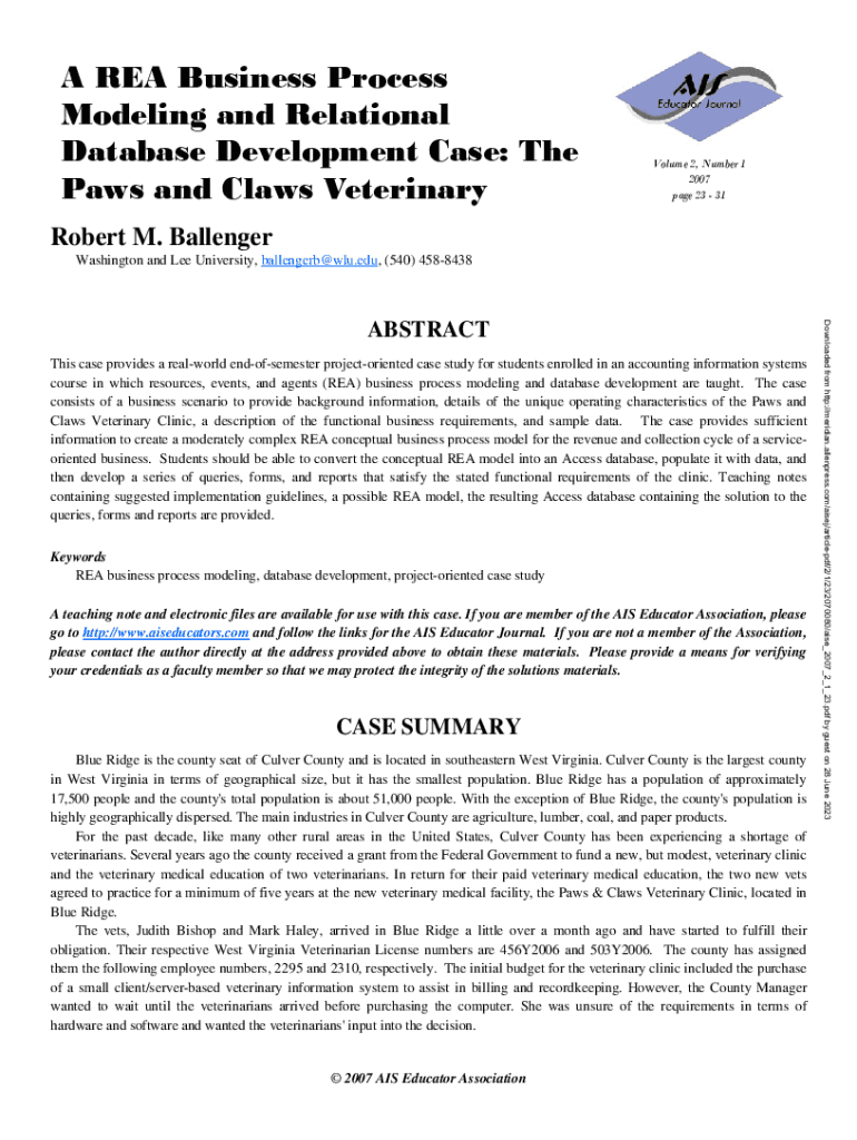 A REA Business Process Modeling and Relational Database Development Case: The Paws and Claws VeterinaryVolume 2, Number 1 2007 page 23 31Robert M. Challenger Washington and Lee University, ballengerb@wlu.edu,
