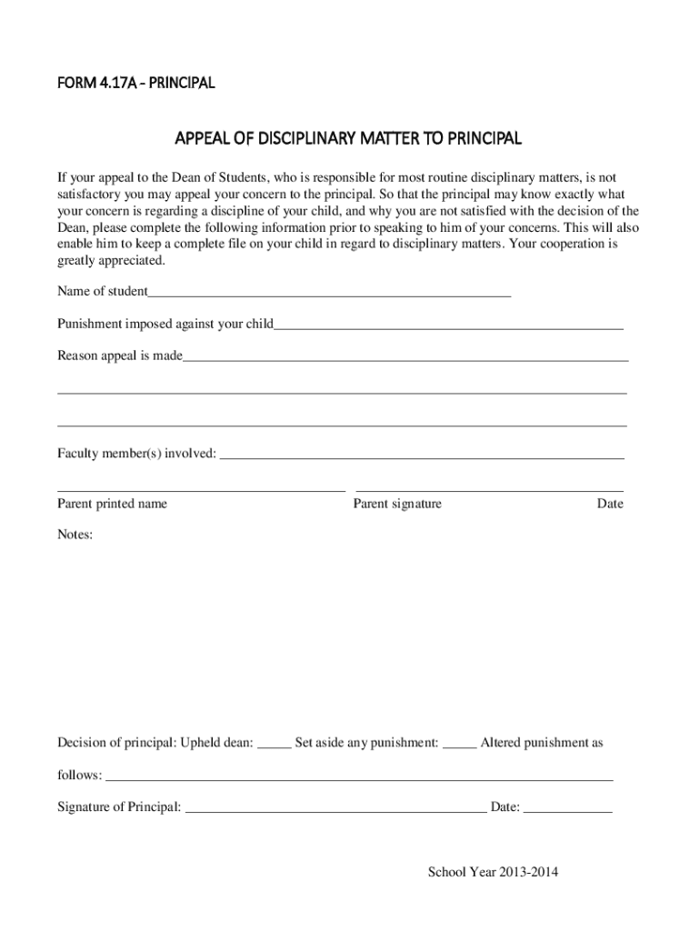 Get the free Form 4.17A - Appeal of Disciplinary Matter to Principal