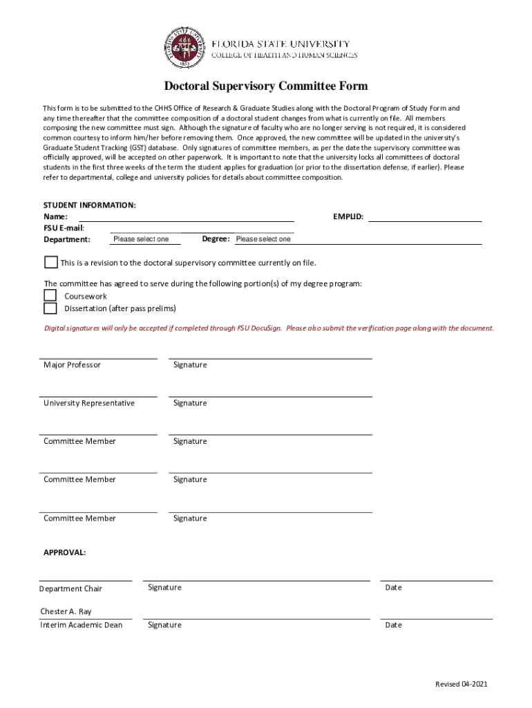 Doctoral Supervisory Committee Form This form is to be submitted to the HHS Office of Research & Graduate Studies along with the Doctoral Program of Study Form and any time thereafter that the committee