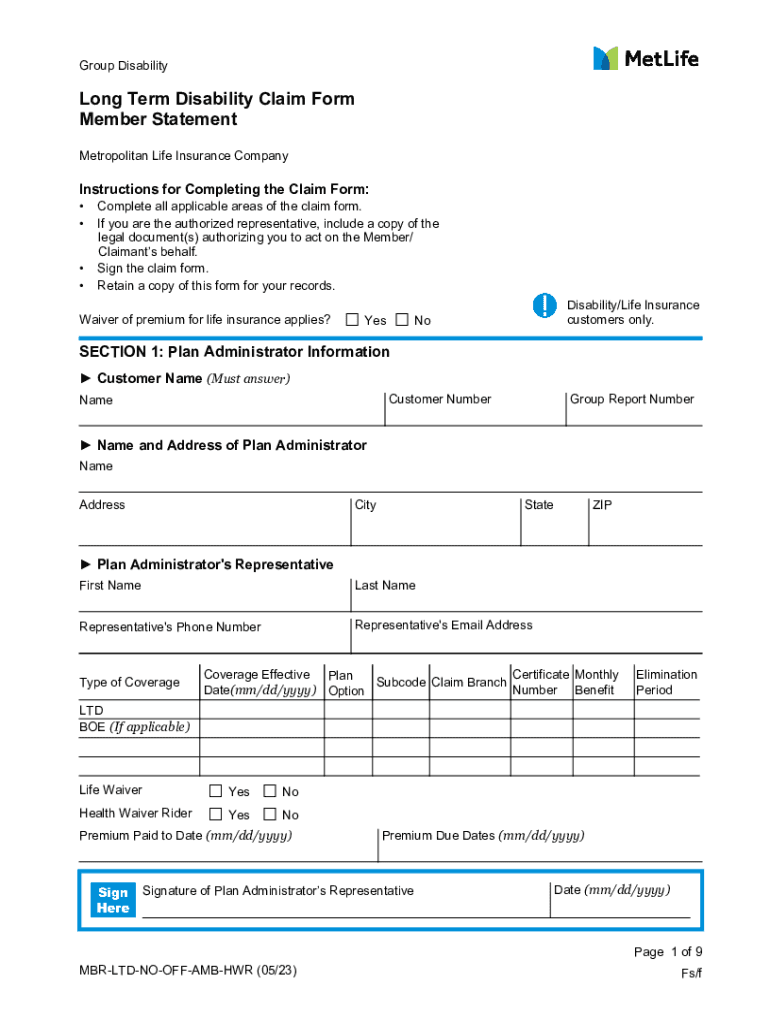 Group Disability Long Term Disability Claim Form Member Statement Metropolitan Life Insurance CompanyInstructions for Completing the Claim Form: Complete all applicable areas of the claim form. If