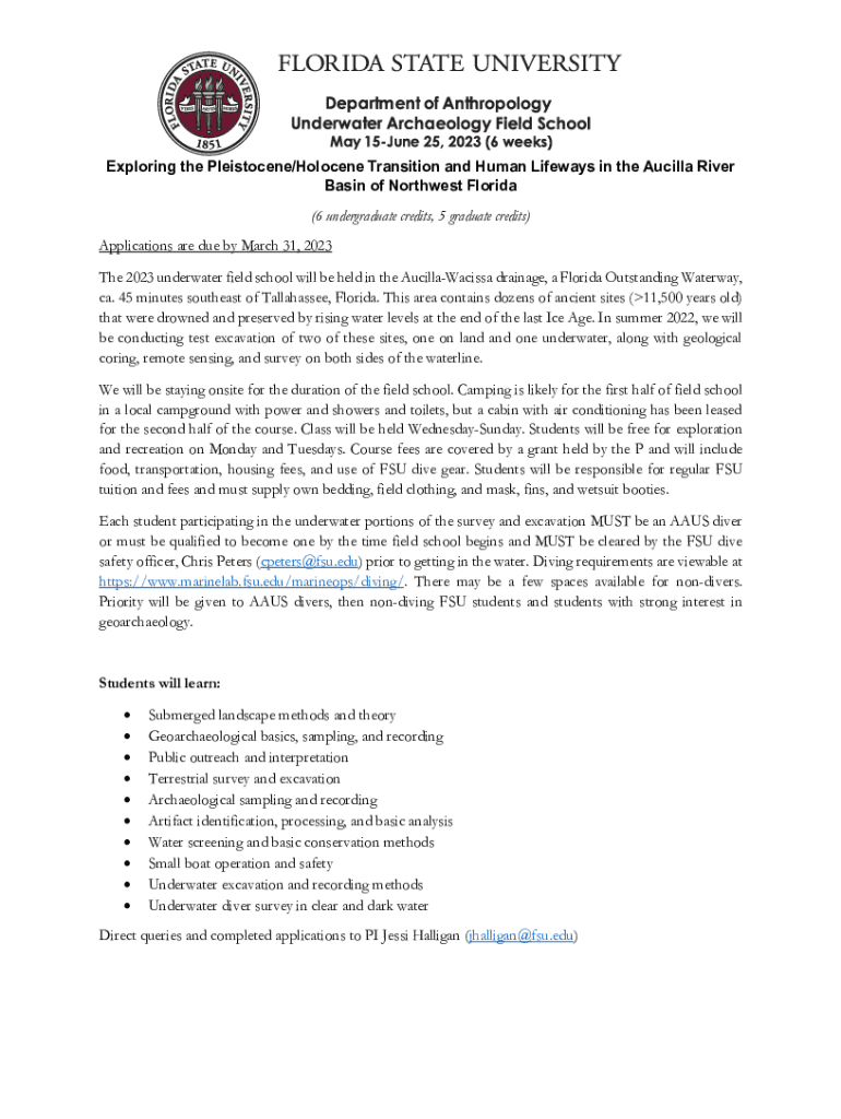 Exploring the Pleistocene/Holocene Transition and Human Lifeways in the Aucilla River Basin of Northwest Florida (6 undergraduate credits, 5 graduate credits) Applications are due by March 31, 2023,