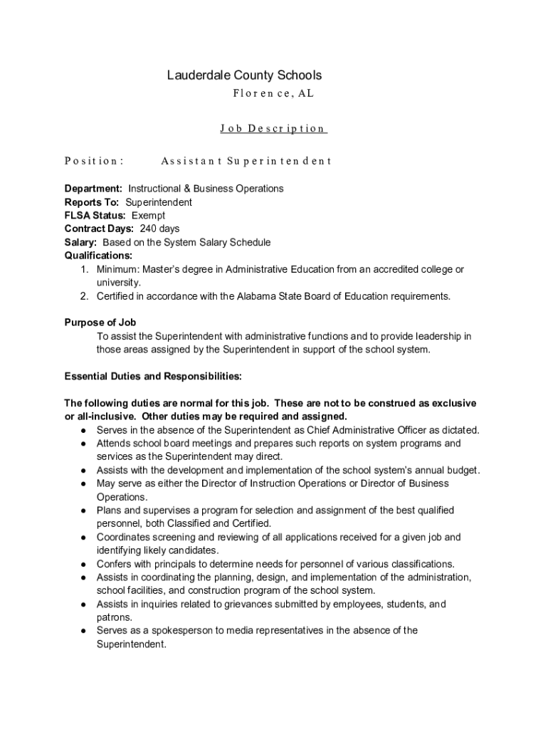 Lauderdale County Schools F l o r e n c e, AL J o b De s CR IP t ion P o s it ion :As s i s t an n t S u p e r i n t e n d e n department: Instructional & Business Operations Reports To: Superintendent