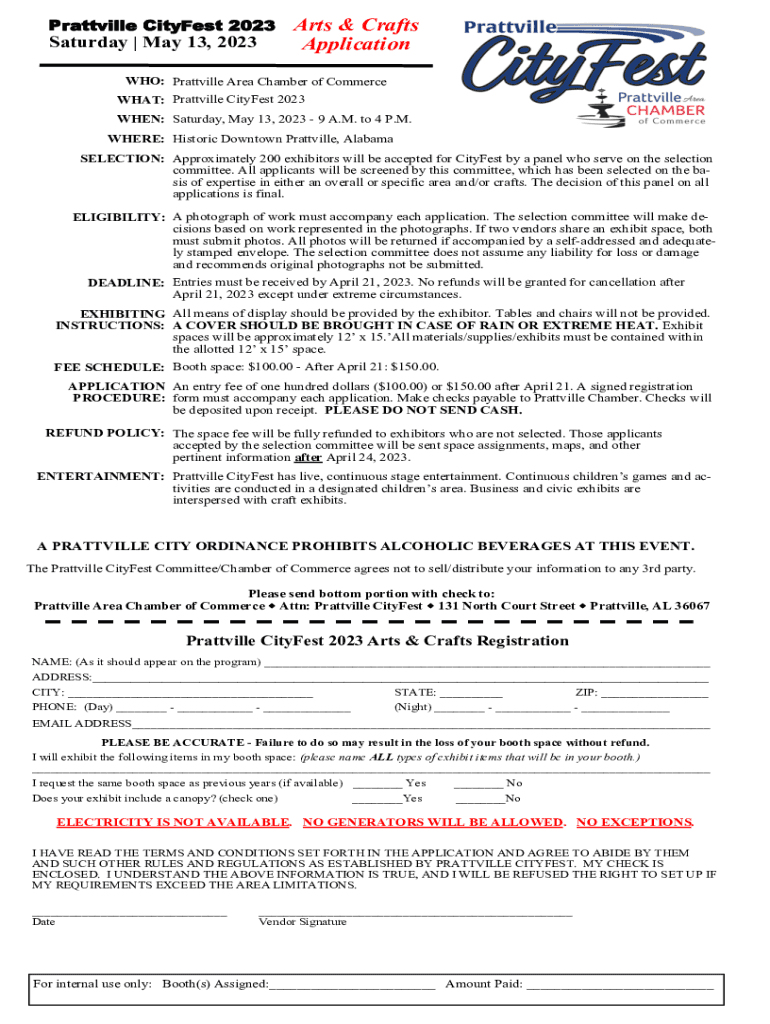 Prattville Cities 2023Saturday | May 13, 2023Arts & Crafts Application WHO: Prattville Area Chamber of Commerce WHAT: Prattville Cities 2023 WHEN: Saturday, May 13, 2023 9 A.M. to 4 P.M. WHERE: Historic