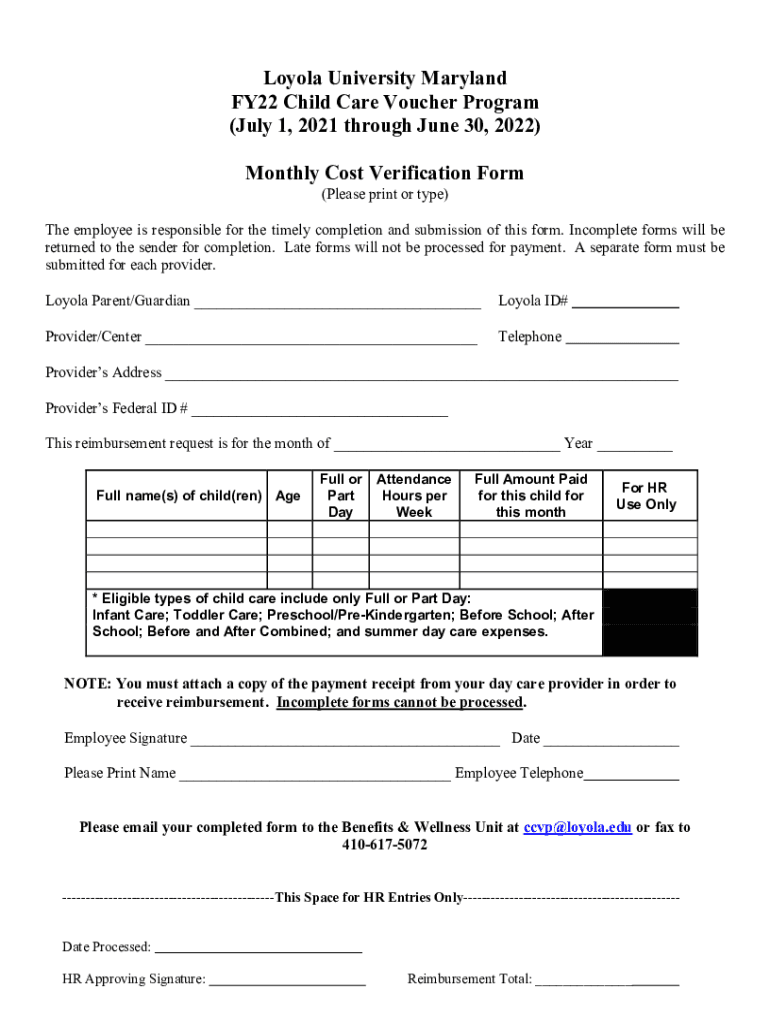 Loyola University Maryland FY22 Child Care Voucher Program (July 1, 2021, through June 30, 2022) Monthly Cost Verification Form (Please print or type) The employee is responsible for the timely completion
