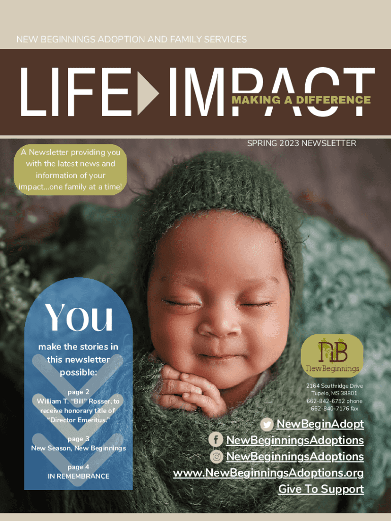 NEW BEGINNINGS ADOPTION AND FAMILY SERVICESLIFE IMPACT MAKING A DIFFERENCE Newsletter providing you with the latest news and information of your impact...one family at a time!SPRING 2023 NEWSLETTERYoumake