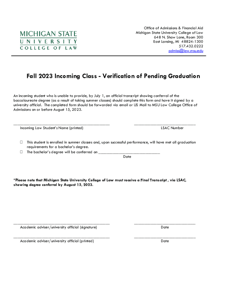 Office of Admissions & Financial Aid Michigan State University College of Law 648 N. Shaw Lane, Room 300 East Lansing, MI 488241300 517.432.0222 admiss@law.msu.eduFall 2023 Incoming Class Verification