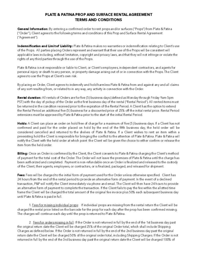 General Information: By entering a con red order to rent props and/or surfaces (Props) from Plate & Patina (Order), Client agrees to the following terms and conditions of this Prop and Surface Rental