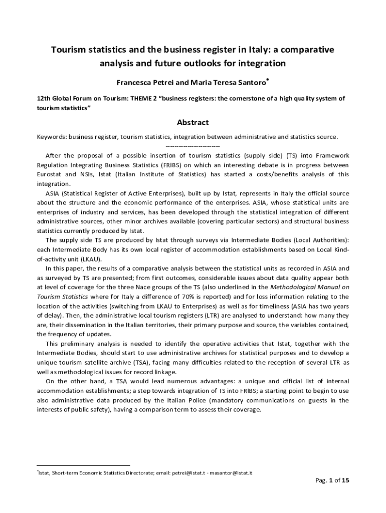Tourism statistics and the business register in Italy: a comparative analysis and future outlooks for integration Francesca Petra and Maria Teresa Santos 12th Global Forum on Tourism: THEME 2 business