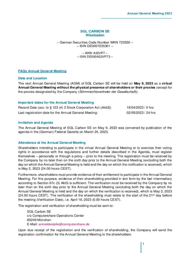 Annual General Meeting 2023 ___SGL CARBON SE Wiesbaden German Securities Code Number WON 723530 ISIN DE0007235301 WON A32VP7 ISIN DE000A32VP73 FAQs Annual General Meeting Date and Location The next