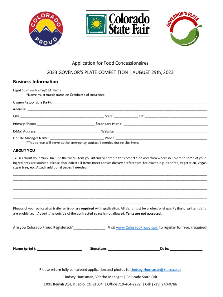 Application for Food Concessionaires 2023 GOVERNORS PLATE COMPETITION | AUGUST 29th, 2023 Business Information Legal Business Name/DBA Name ___ *Name must match name on Certificate of Insurance Owner/Responsible
