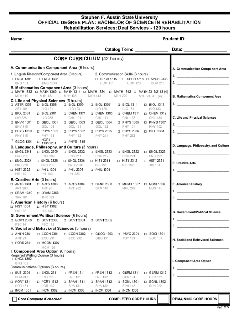 Stephen F. Austin State University OFFICIAL DEGREE PLAN: BACHELOR OF SCIENCE IN REHABILITATION Services: Deaf Services 120 hours Name: ___ ___Student ID: ___Catalog Term: ___ Date: ___CORE CURRICULUM