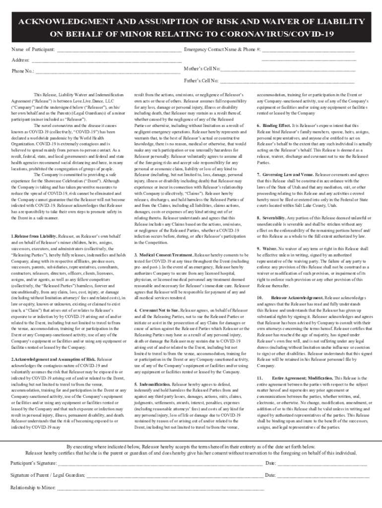 ACKNOWLEDGMENT AND ASSUMPTION OF RISK AND WAIVER OF LIABILITY ON BEHALF OF MINOR RELATING TO CORONAVIRUS/COVID-19 NameofParticipant:___ Emergency Contact Name & Phone #: ______Address:___Phone No.:
