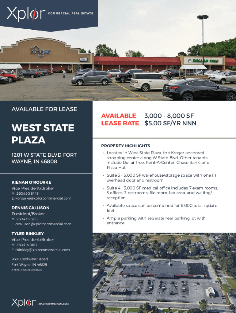 AVAILABLE FOR EASIEST STATE PLAZA 1201 W STATE BLVD FORT WAYNE, IN 46808KIENAN O\'ROURKE Vice President/Broker M: 260.450.8443 E: korourke@xplorcommercial.comDENNIS ALLISON President/Broker M: 260.438.6251
