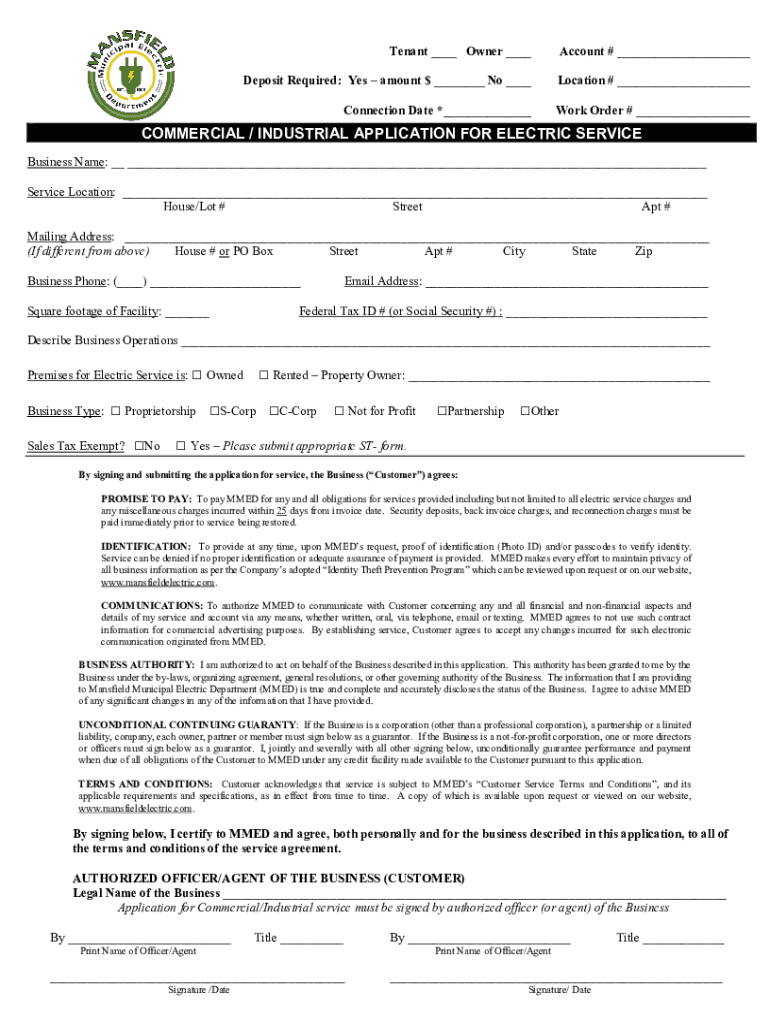 Tenant ___ Owner ___Account # ___Deposit Required: Yes amount $ ___ No ___Location # ___Connection Date *___Work Order # ___COMMERCIAL / INDUSTRIAL APPLICATION FOR ELECTRIC SERVICE Business Name: