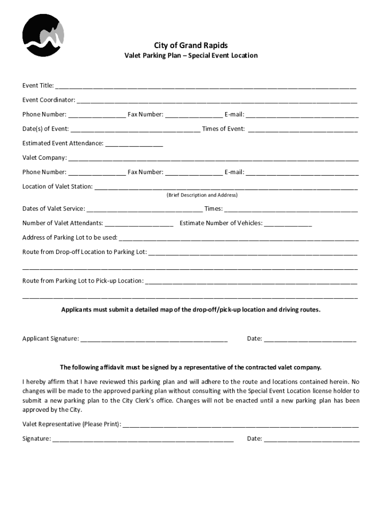 City of Grand Rapids Valet Parking Plan Special Event LocationEvent Title: ___ Event Coordinator: ___ Phone Number: ___ Fax Number: ___ Email: ___ Date(s) of Event: ___ Times of Event: ___ Estimated