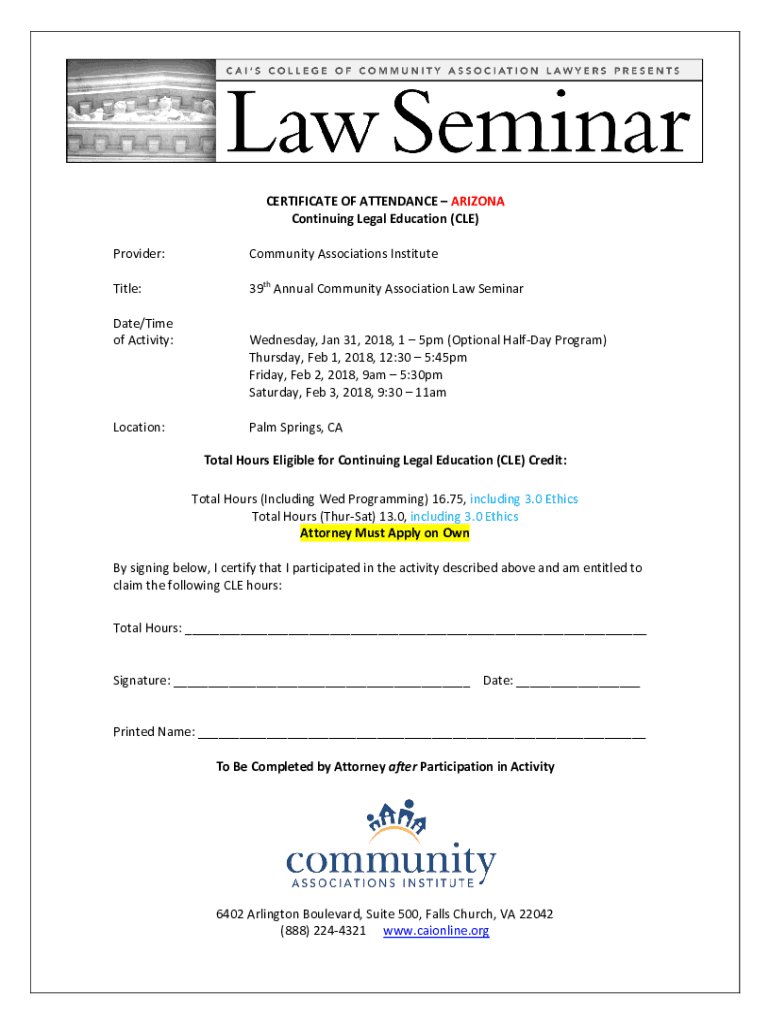 CERTIFICATE OF ATTENDANCE ARIZONA Continuing Legal Education (CLE) Provider:Community Associations InstituteTitle:39th Annual Community Association Law Seminarians/Time of Activity:Location:Wednesday,