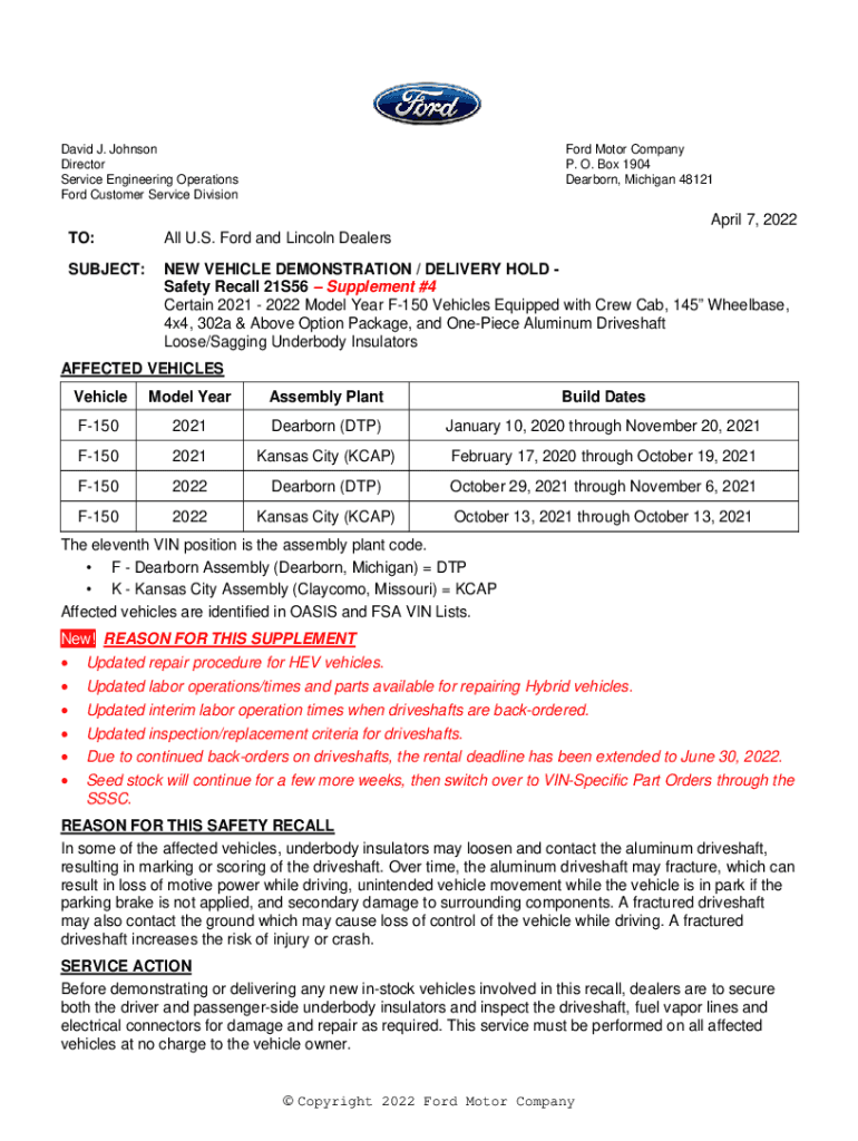 David J. Johnson Director Service Engineering Operations Ford Customer Service Division Ford Motor Company P. O. Box 1904 Dearborn, Michigan 48121April 7, 2022 TO:All U.S. Ford and Lincoln DealersSUBJECT:NEW