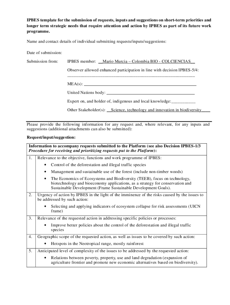 IP BES template for the submission of requests, inputs and suggestions on short term priorities and longer term strategic needs that require attention and action by IP BES as part of its future work