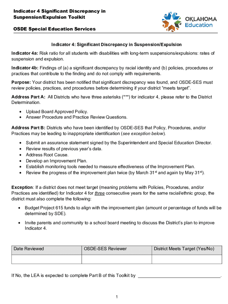 Indicator 4 Significant Discrepancy in Suspension/Expulsion Toolkit ODE Special Education Services Indicator 4: Significant Discrepancy in Suspension/Expulsion Indicator 4a: Risk ratio for all students