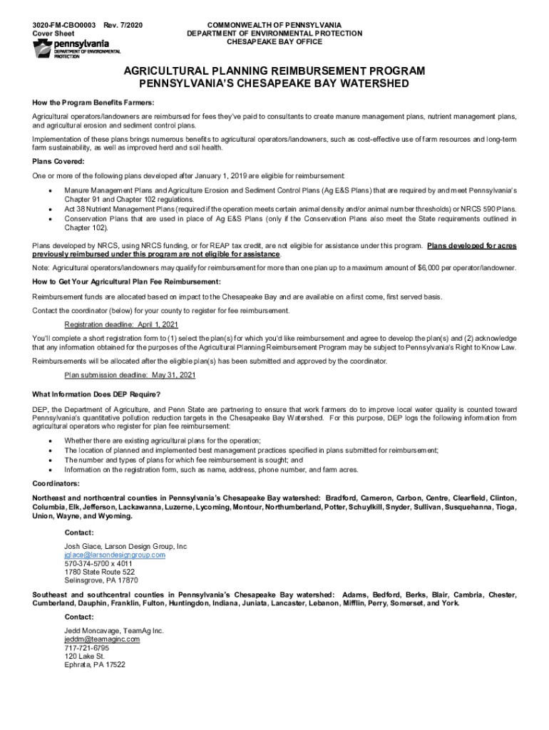 3020FMCBO0003 Cover Sheet Rev. 7/2020COMMONWEALTH OF PENNSYLVANIA DEPARTMENT OF ENVIRONMENTAL PROTECTION CHESAPEAKE BAY OFFICEAGRICULTURAL PLANNING REIMBURSEMENT PROGRAM PENNSYLVANIA CHESAPEAKE BAY