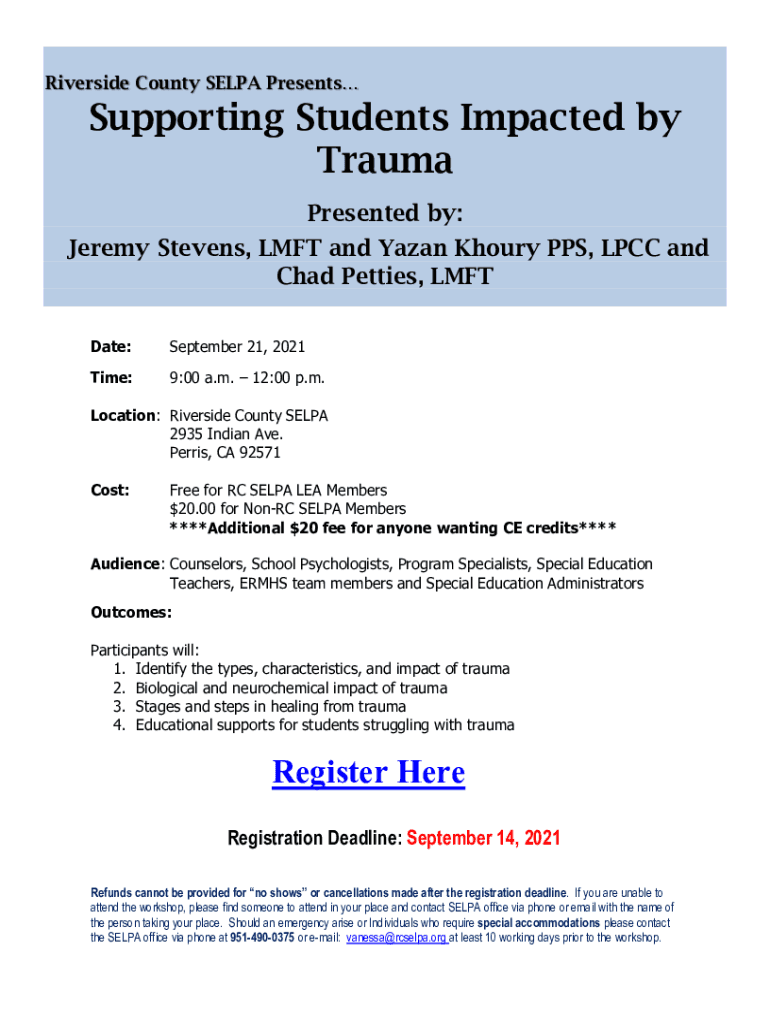 Riverside County SELMA PresentsSupporting Students Impacted by Trauma Presented by: Jeremy Stevens, LEFT and Kazan Hours PPS, PCC and Chad Jetties, LEFT Date:September 21, 2021Time:9:00 a.m. 12:00