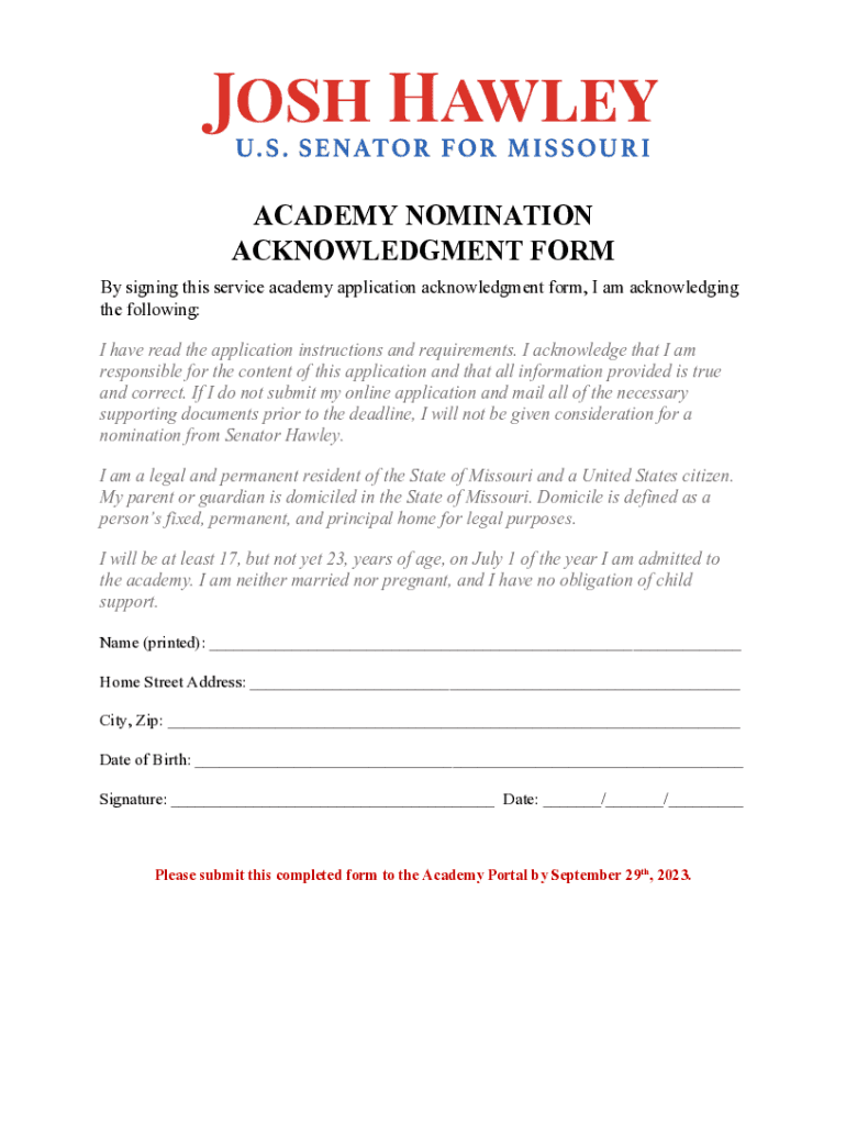 ACADEMY NOMINATION ACKNOWLEDGMENT FORM By signing this service academy application acknowledgment form, I am acknowledging the following: I have read the application instructions and requirements.