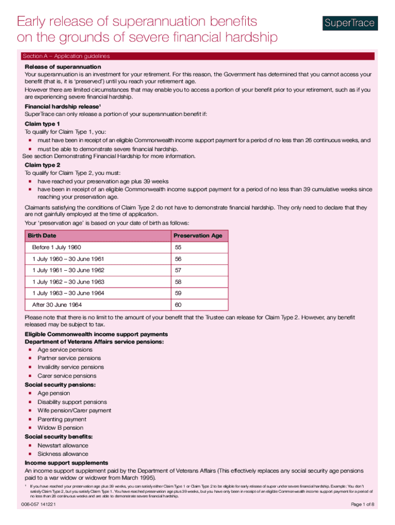Early release of superannuation benefits on the grounds of severe financial hardship Section A Application guidelines Release of superannuation Your superannuation is an investment for your retirement.