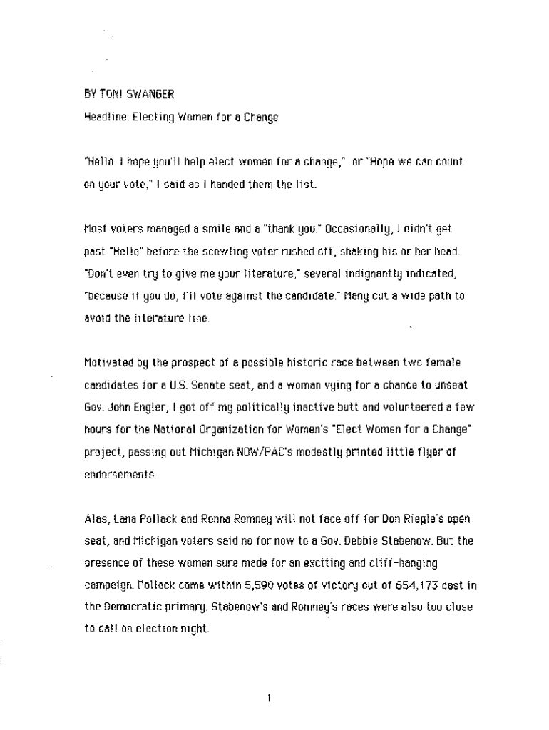 BV TON! SV/ ANGER Headline: Electing \'w\'omen for a Change\” Hello. I hope you\'ll help elect women for a change, \” or \” Hope we can count on your vote, \” I said as I handed them the last’t\'most