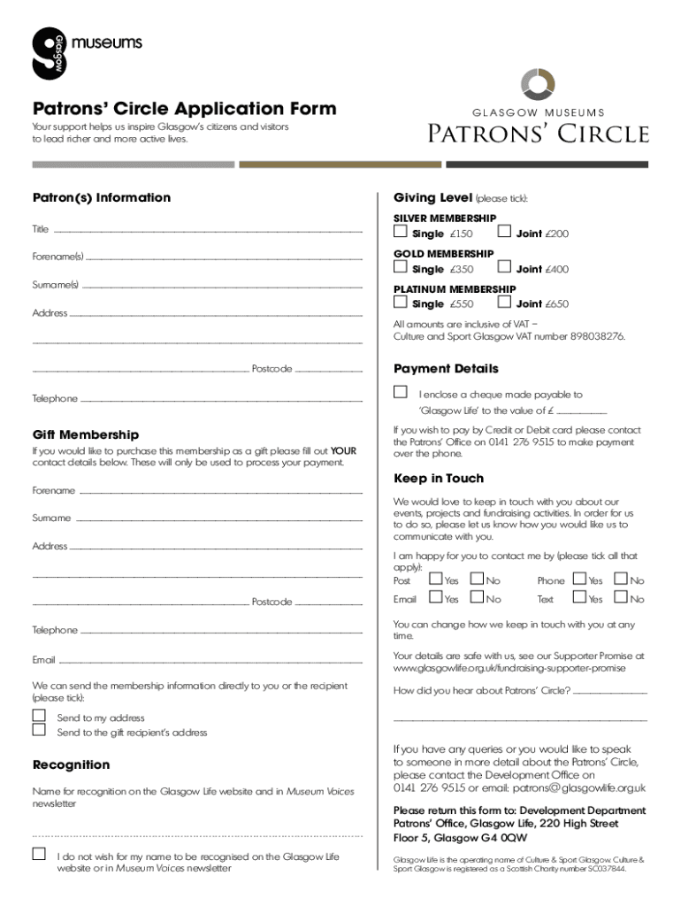 Patrons Circle Application FormGLASGOW MUSEUMSPatrons CircleYour support helps us inspire Glasgow's citizens and visitors to lead richer and more active lives. Patron(s) Information Title ...................................................................................................................................................................................................