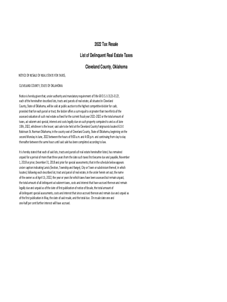 2022 Tax Resale List of Delinquent Real Estate Taxes Cleveland County, Oklahoma NOTICE OF RESALE OF REAL ESTATE FOR TAXES, CLEVELAND COUNTY, STATE OF OKLAHOMA Notice is hereby given that, under authority