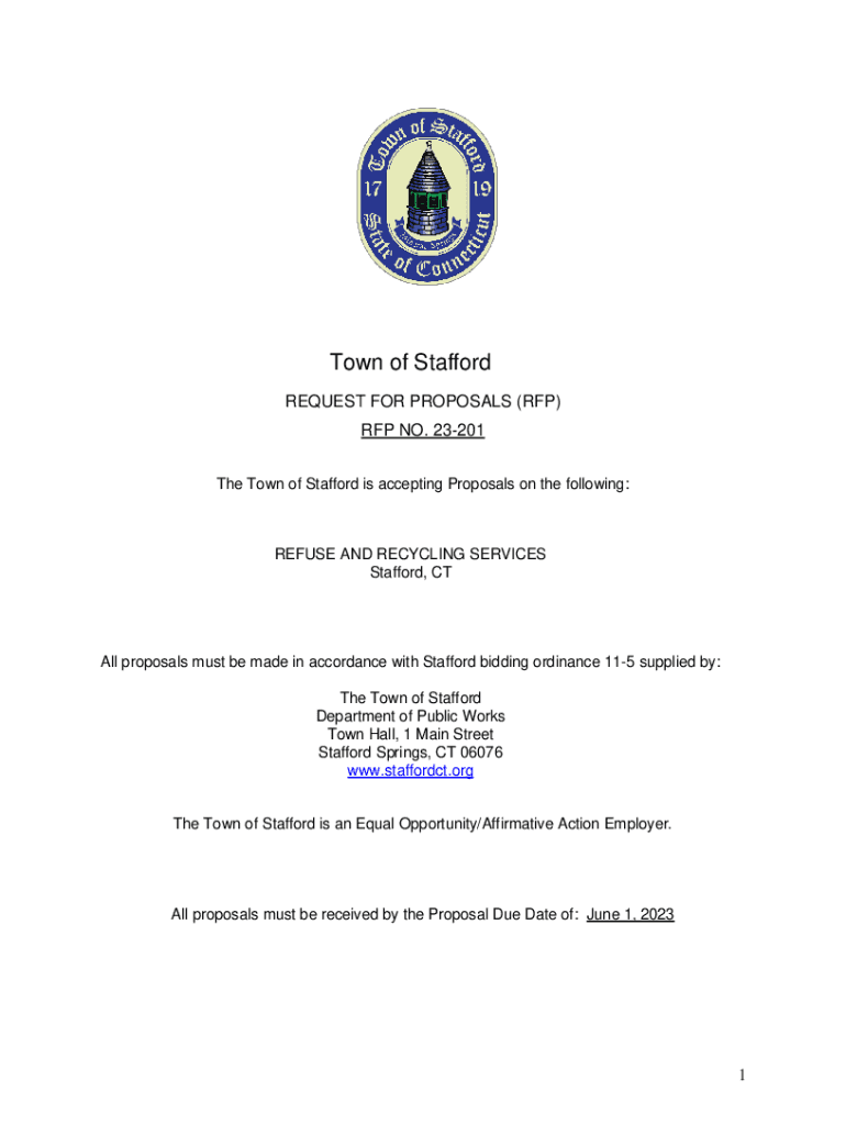 Town of Stafford REQUEST FOR PROPOSALS (RFP) RFP NO. 23201 The Town of Stafford is accepting Proposals on the following:REFUSE AND RECYCLING SERVICES Stafford, Call proposals must be made in accordance