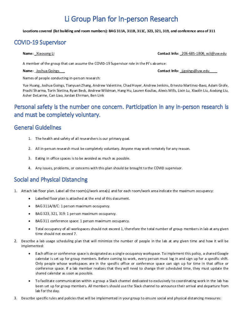 Li Group Plan for Unperson Research Locations covered (list building and room numbers): BAG 311A, 311B, 311C, 323, 321, 319, and conference area of 311COVID19 Supervisor Name: _Xiaoping Contact Info: