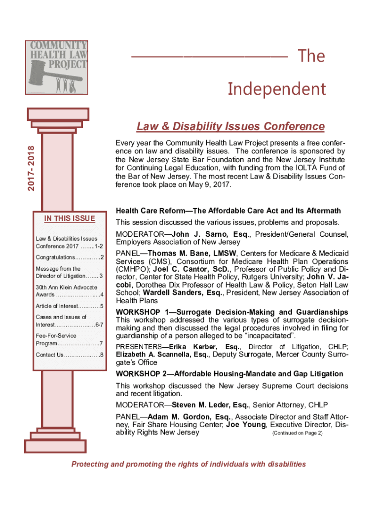 The Independent Law & Disability Issues Conference 2017 2018Every year the Community Health Law Project presents a free conference on law and disability issues. The conference is sponsored by the