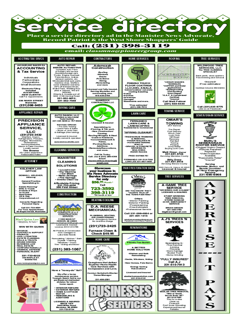 Place a service directory ad in the Minister News Advocate,