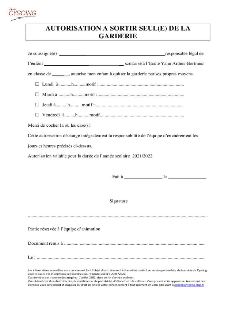 Obtenir le gratuit AUTORISATION A SORTIR SEUL(E) DE LA GARDERIE