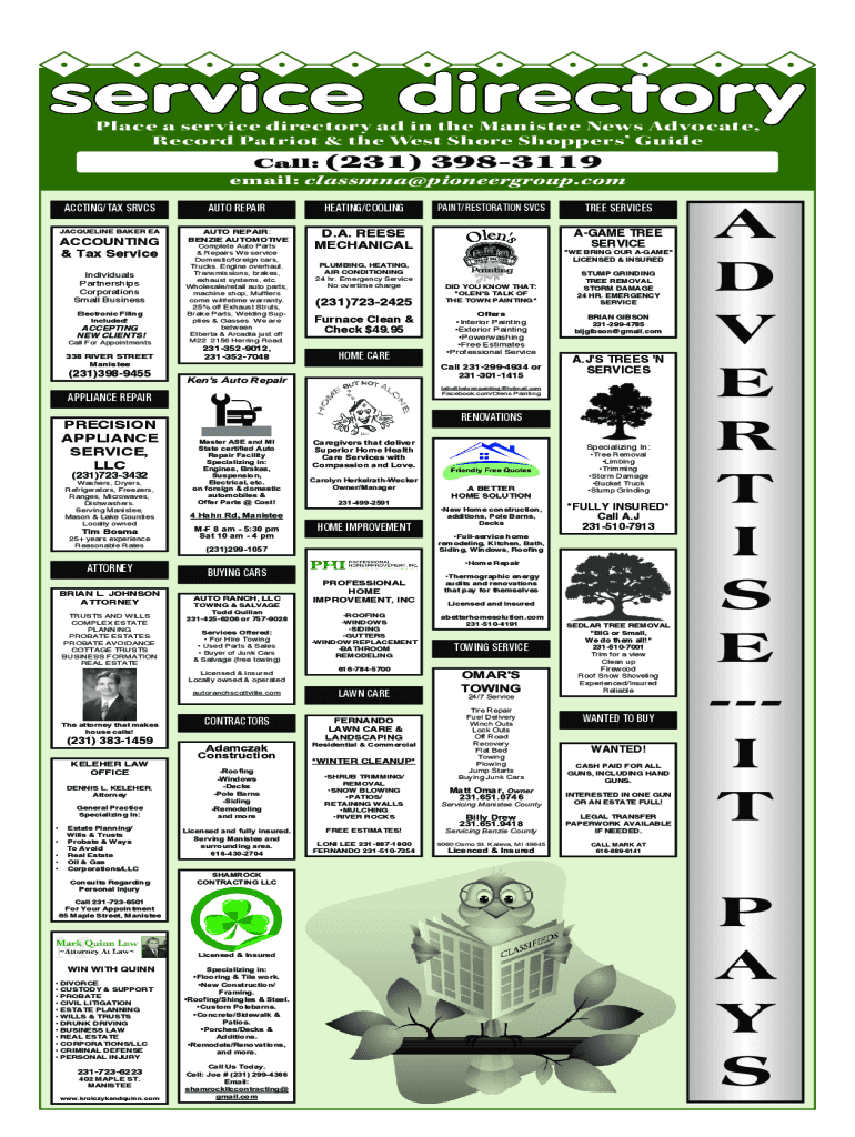 Service directory Place a service directory ad in the Minister News Advocate, Record Patriot & the West Shore Shoppers Guide Call: (231) 3983119 email: classmna@pioneergroup.com ACTING/TAX SRVCSAUTO