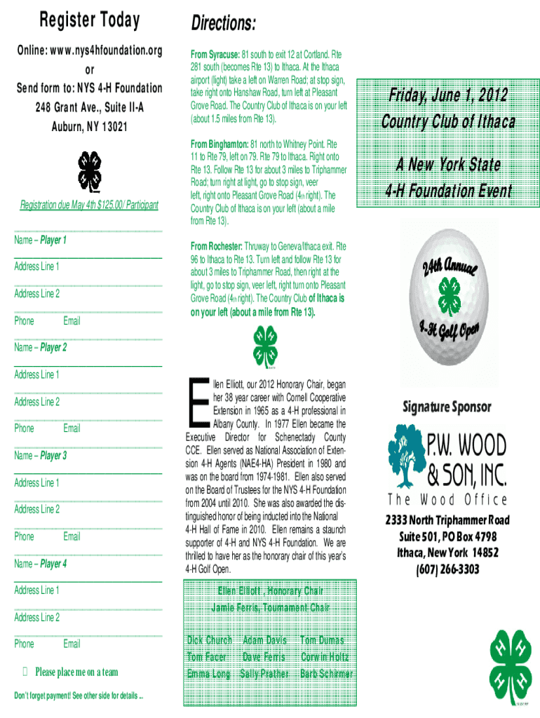 Register Today Online: www.nys4hfoundation.org or Send form to: NYS 4H Foundation 248 Grant Ave., Suite IIA Auburn, NY 13021Registration due May 4th $125.00/ Participant ___ Name Player 1 ___ Address
