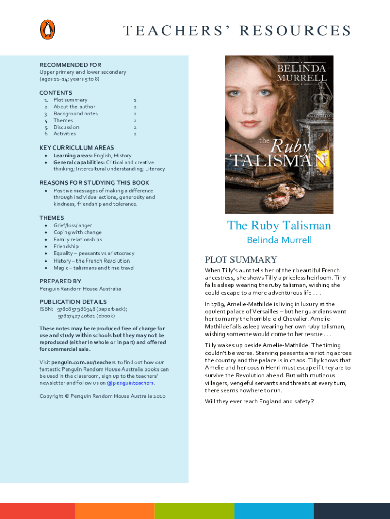 TEACHERS RESOURCES RECOMMENDED FOR Upper primary and lower secondary (ages 1114; years 5 to 8)CONTENTS 1. 2. 3. 4. 5. 6. Plot summary About the author Background notes Themes Discussion Activities1